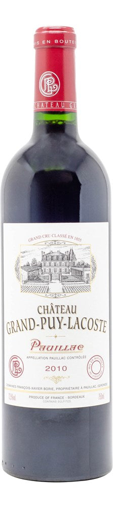 Reviews 93 points Wine Advocate "Deep garnet in color, the 2010 Grand-Puy-Lacoste is a little subdued to begin, opening out to reveal notes of black cherries, stewed plums and blackberry preserves with hints of bouquet garni, tapenade and dried lavender. Medium to full-bodied, the palate has a firm, chewy texture and lively acidity, slightly over-shadowing the delicate, fading fruit, finishing on a stewed tea note. (LPB)" 97 points Vinous "Saturated ruby. Very-ripe-verging-on-overripe nose dominated by strawberry liqueur, black fruits and faded flowers. Creamy and sweet but with very good acidity giving shape to the middle palate, this shows distinct hints of surmaturite to its sweet, creamy red and black fruit flavors. Finishes with mounting, slightly dry tannins, but there's so much fruit here that I'm confident that time in bottle will bring more volume and flesh. (IDA)"